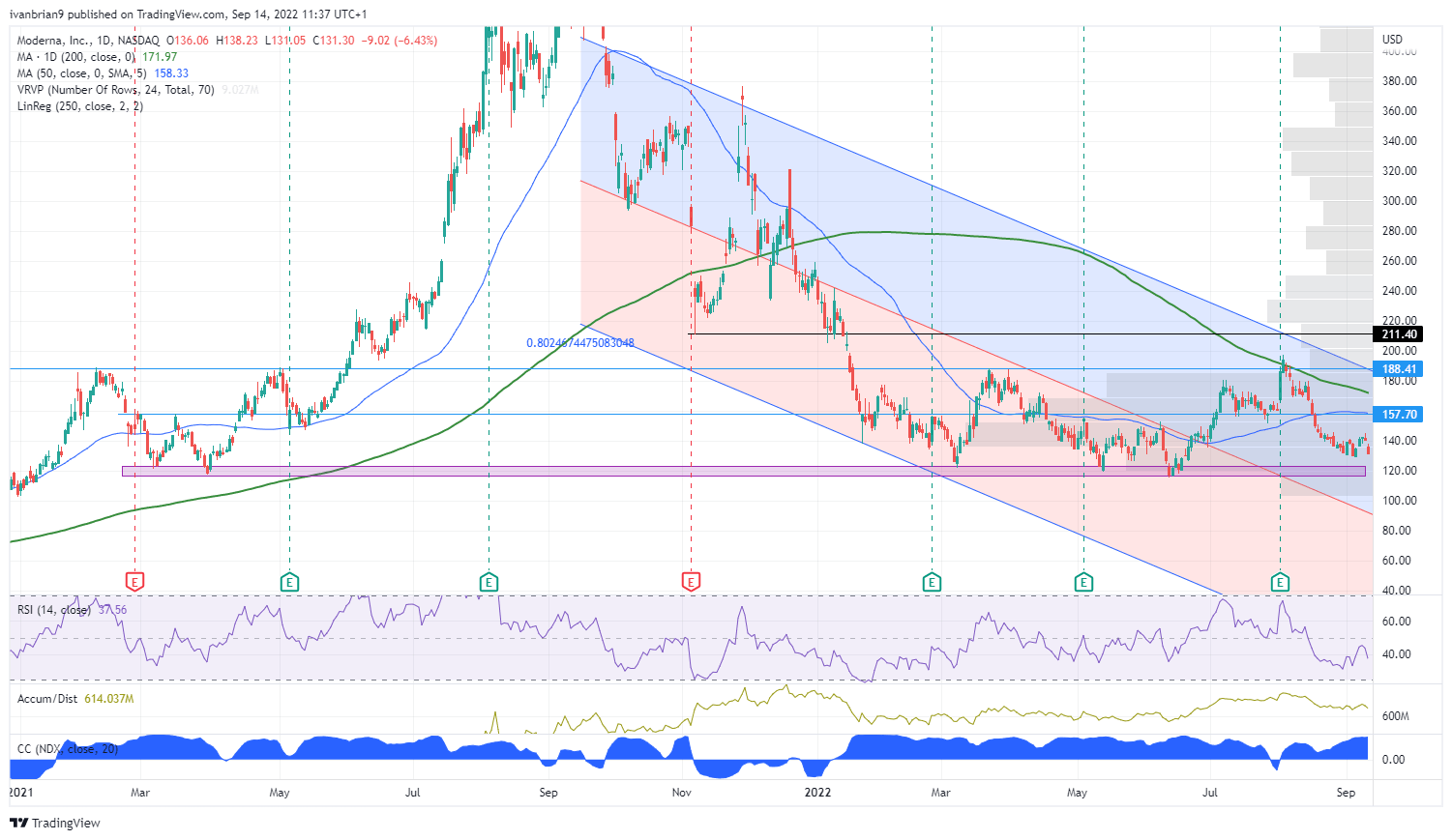 This is for now a short-term opportunity to perhaps bottom fish after Tuesday's sell-off and see if this story gets more legs to it. Moderna is perched precariously on support at $125, and a break will target then $100. This $120 to $125 zone has been held several times going back to March 2021, so it is key support.