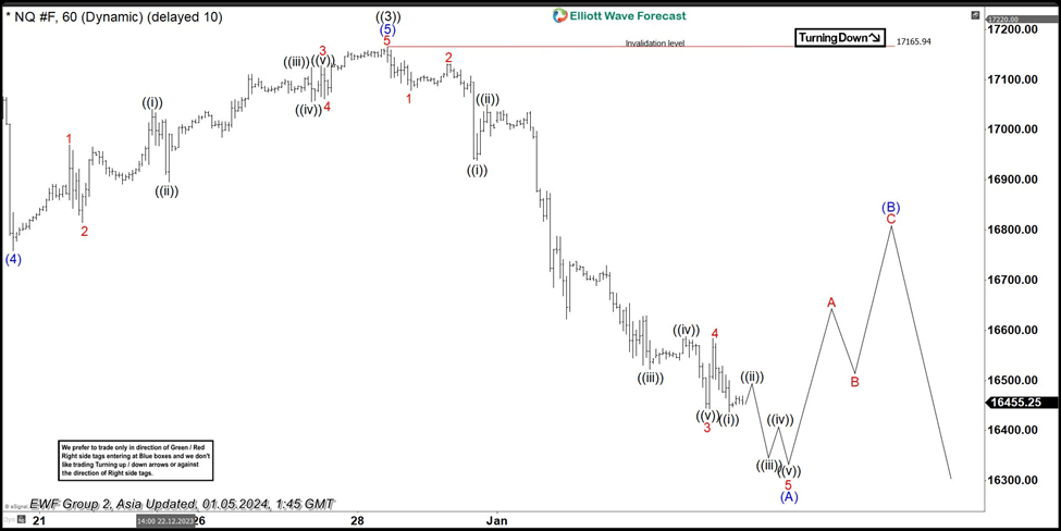 Nasdaq 100 (NQ_F )shows a bullish sequence from October 2022 low favoring further upside. The rally higher from 10.13.2022 is unfolding as Elliott Wave leading diagonal. Up from 10.13.2022 low, wave ((1)) ended at 16062.75 and pullback in wave ((2)) ended at 14140.25 low. Wave ((3)) finished at 17165.94 high as the 1 hour chart below shows. Pullback as wave ((4)) is currently in progress with internal subdivision of a zigzag (A), (B) and (C).