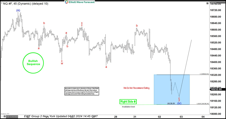 The current view indicates that the intraday pullback is still in progress. We assume that the correction is unfolding as an Elliott Wave Double Three pattern with wxy red labeling. The price structure remains incomplete at the moment, suggesting further downside towards the 18322-18138.2 Blue Box Buying Zone. We don’t recommend selling NASDAQ; instead, we prefer positioning ourselves on the long side from the Blue Box area. Once NQ_F reaches our designated buying zone, we expect an influx of buyers, potentially resulting in a rally towards new highs or a 3-wave bounce.