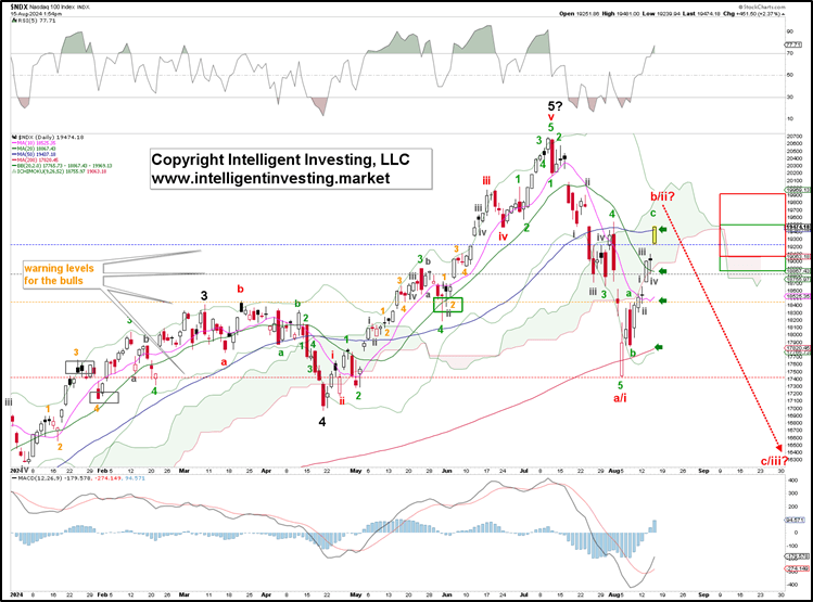 Namely, earlier this month, we anticipated a low at “ideally the support zone at $18200-400. From there, the red W-b/ii back to ideally a 50-76.4% retracement of the red W-a/i must be anticipated: $19300-800.“ Last Monday, August 5, the index bottomed out at $17435, 4.2% below the ideal target zone. Thus, we got the direction right but the magnitude wrong. However, the index rallied from there as expected and is now trading in the $19470s.