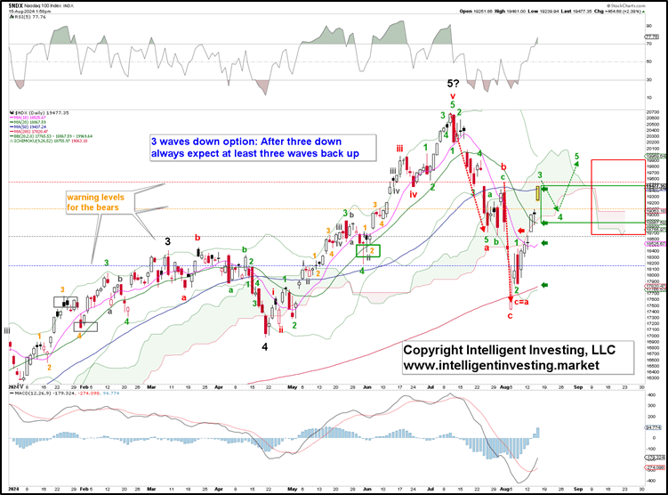 Figure 1. NDX daily chart with detailed EWP count and technical indicators