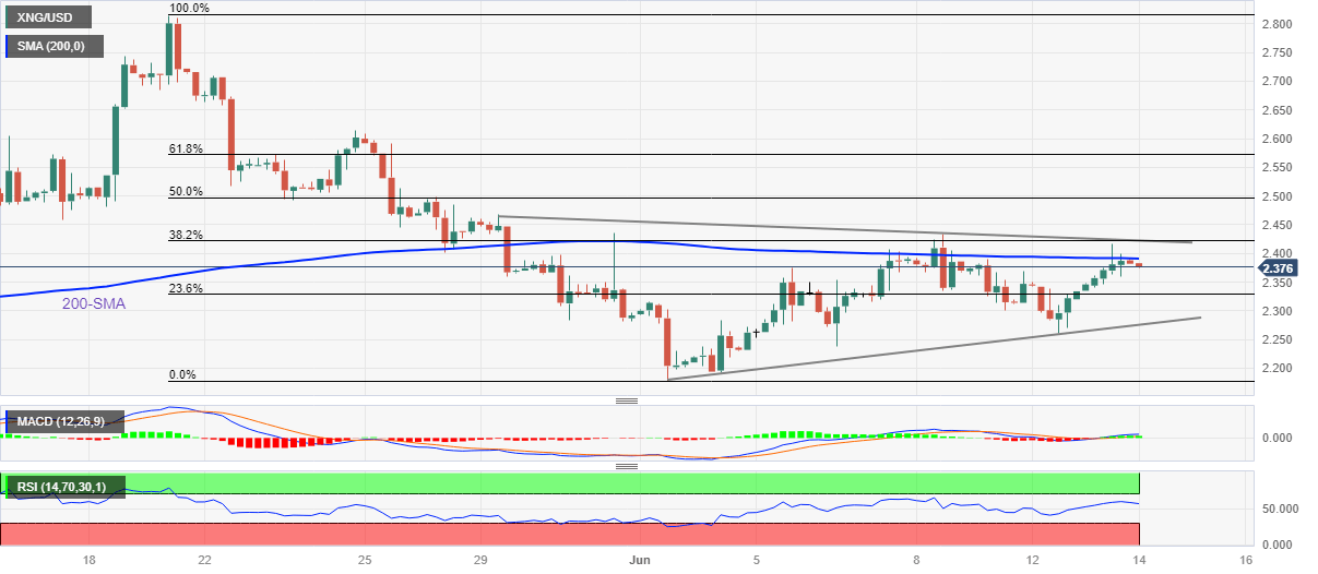 - Two-week-old symmetrical triangle challenges XNG/USD bears beyond $2.27; bulls need validation from $2.42.