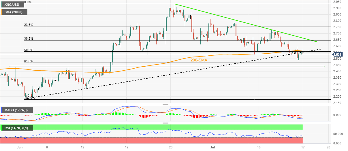 - Previous support line from early June, 200-SMA prods XNG/USD buyers amid downbeat RSI.