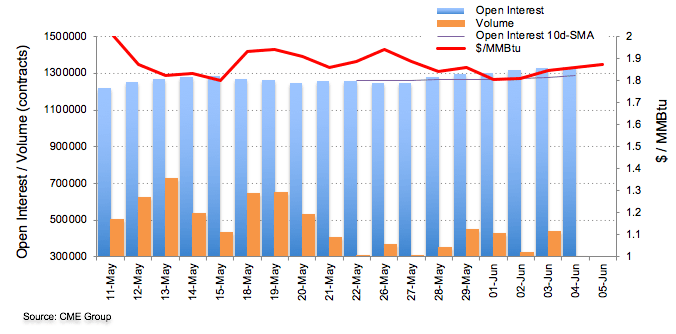 Advanced figures for Natural Gas futures markets from CME Group noted open interest extended the uptrend on Thursday, this time rising by around 5.6K contracts. On the other hand, volume reversed the previous build and shrunk by around 157.6K contracts.