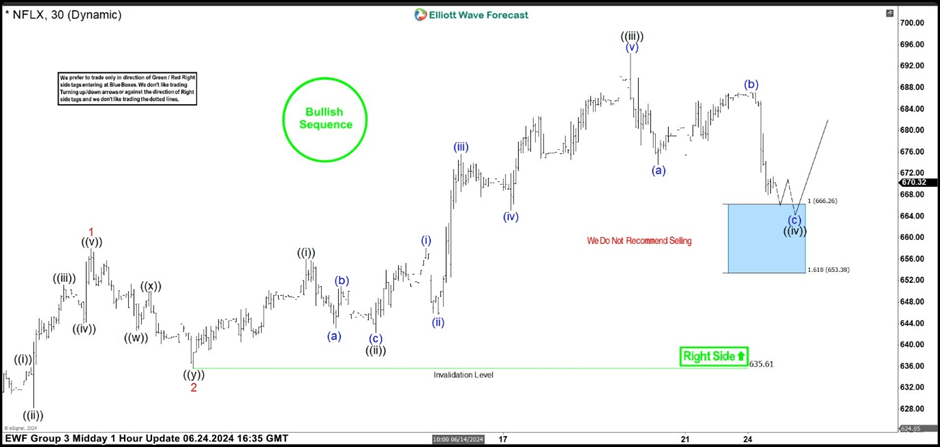 Netflix stock is currently in a wave ((iv)) pullback, unfolding as an Elliott Wave Zig Zag pattern. We’ve labeled the pullback as (a) (b) (c) in blue. The pullback is still incomplete at the moment. The stock should ideally see an extension down toward the blue box-buying zone: the 666.26-653.38 area. We expect the stock to rally toward new highs or bounce in 3 waves from there. When the price retraces to the 50% Fibonacci level against the (b) blue connector, we’ll secure positions, set the stop loss at breakeven, and take partial profits.