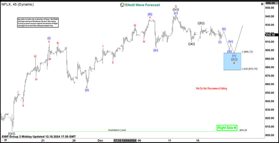 Netflix stock is currently in a wave 4red pullback, unfolding as 3 waves ((a))((b))((c)) pattern. The stock should ideally see an extension down toward the blue box-buying zone: the 896.73-876.79 area. We expect the stock to rally toward new highs or bounce in 3 waves from there. When the price retraces to the 50% Fibonacci level against the ((b) )blue connector, we’ll secure positions, set the stop loss at breakeven, and take partial profits.