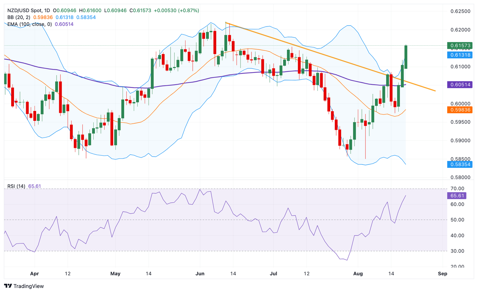 The New Zealand Dollar trades on a softer note on the day. The NZD/USD pair keeps the bullish vibe on the daily chart as the pair holds above the descending trendline and the key 100-day Exponential Moving Average (EMA). The upward momentum is bolstered by the 14-day Relative Strength Index (RSI), which stands above the midline near 65.60, suggesting that further upside looks favorable.