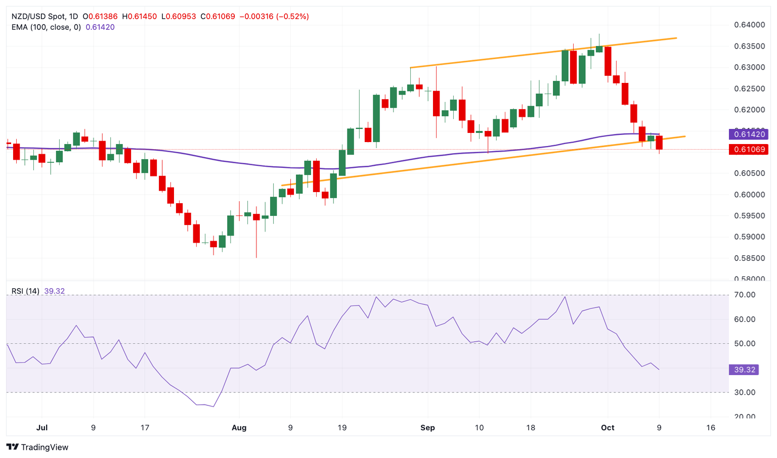 The New Zealand Dollar weakens on the day. The NZD/USD pair continues its downtrend as it crosses below the key 100-day Exponential Moving Average (EMA) and is poised to break below the ascending trend channel on the daily chart. The downward momentum is supported by the 14-day Relative Strength Index (RSI), which stands below the midline near 41.10, supporting the sellers in the near term.