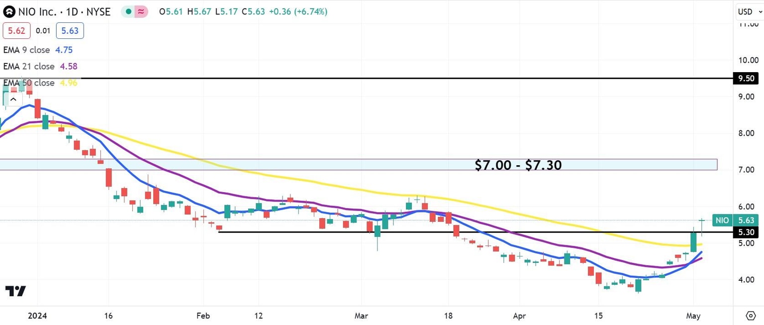 NIO stock needs to remain above the support level of $5.30 that draws its significance from February and March of this year. The next bet is a retest of the $7.00 to $7.30 range that held support in October through December of last year and that bulls will endeavor to turn back into support.