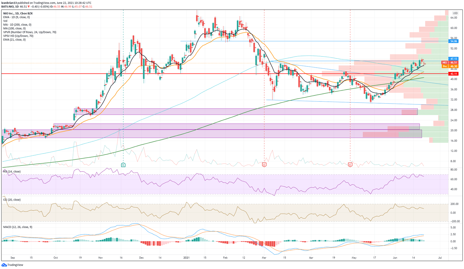 Monday saw NIO shares give up some recent ground, but the strong run is still held in place by the 9-day moving average. Monday's low of $45.07 found support at the 9-day moving average and kept the short-term bullish trend in place. The chart below shows just how well this moving average has been holding the up move. The resistance at $47.13 was briefly broken, but nothing sustained itself so this remains the short-term target. This is the entry of the wedge formation in place since March and a break is another bullish sign. Above that, the next resistance level is at $54.86. The volume profile on the right of the chart shows just how quickly it dries up, so breaking here could and should see a price acceleration.