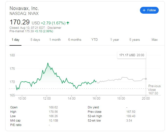 NASDAQ: NVAX has surged above $171 in after-hours trading, an increase of nearly 9% ahead of Wednesday's regular trading session.