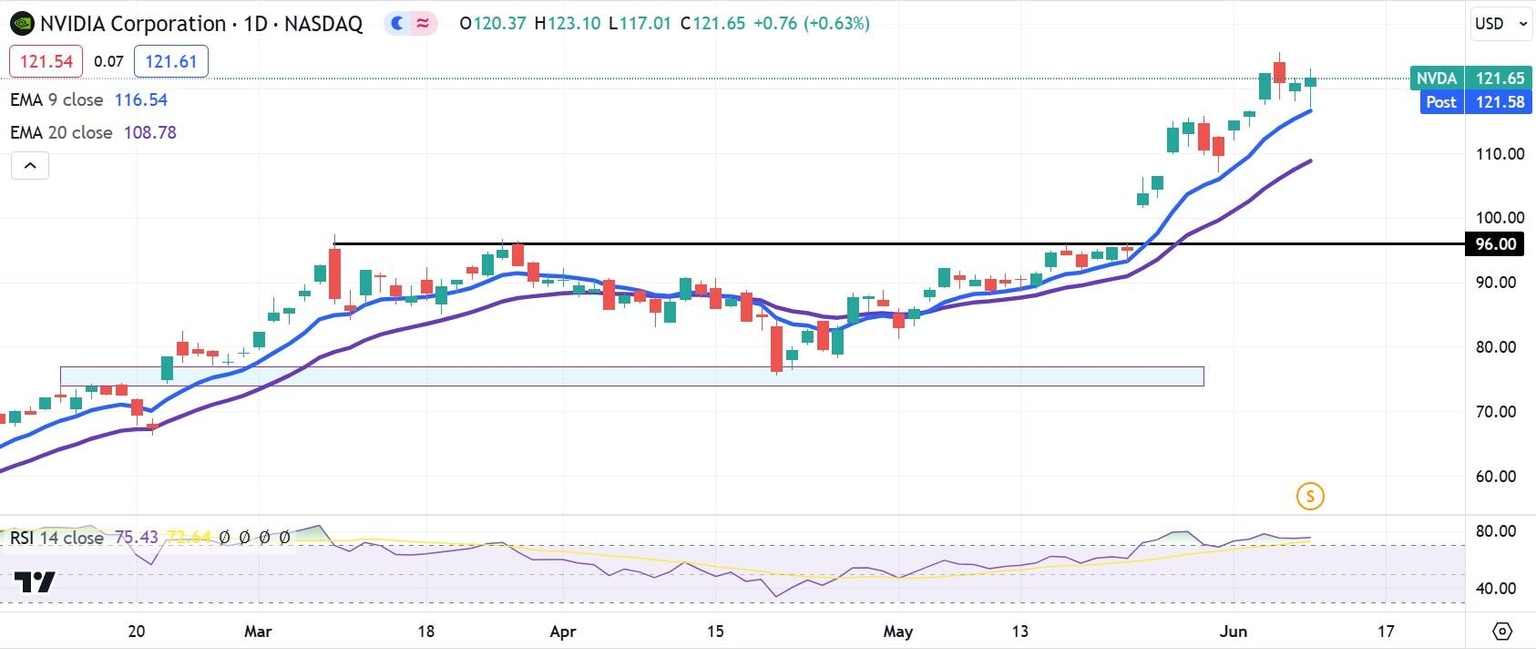 Nvidia stock is a bit overextended, based on the Relative Strength Index (RSI) on the daily chart below. It's largely remained that way for the past three weeks. When you account for appoximately 90% of the AI chip market, things can stay that way.