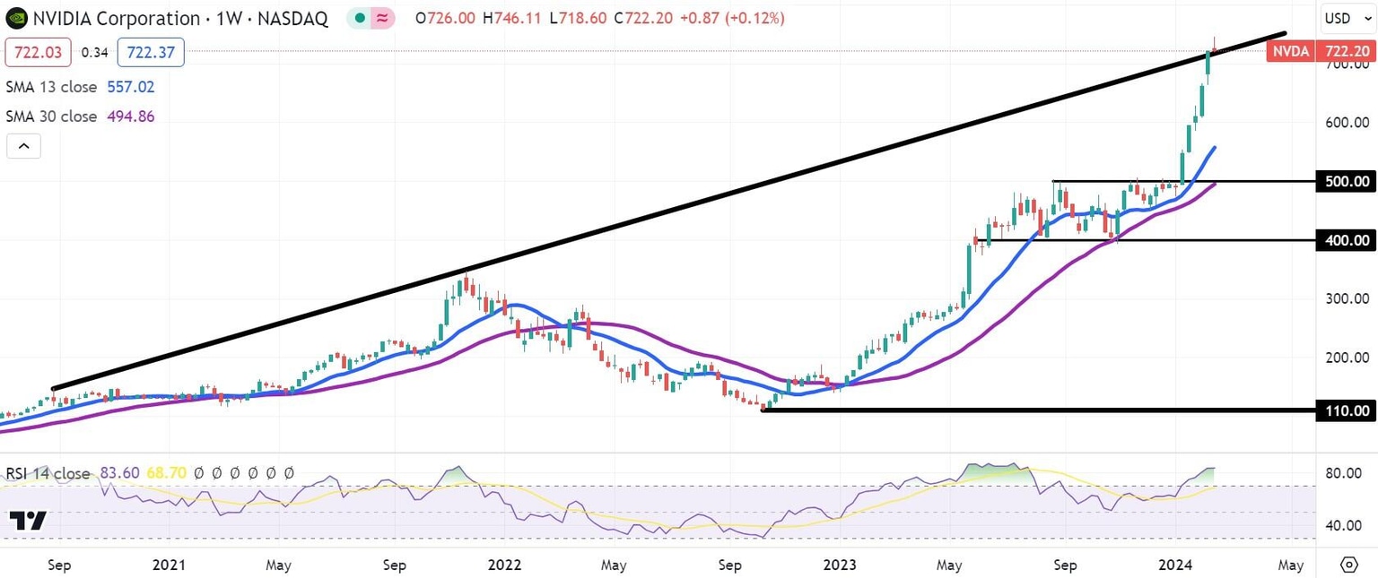 Nvidia stock did briefly break above the top trendline, so it seems plausible that bulls might turn the long-term trendline into a support structure. But the main obstacle would seem to be the weekly chart’s Relative Strength Index (RSI). It is looking exceedingly overbought at present, so some level of consolidation would appear to be the more obvious course.