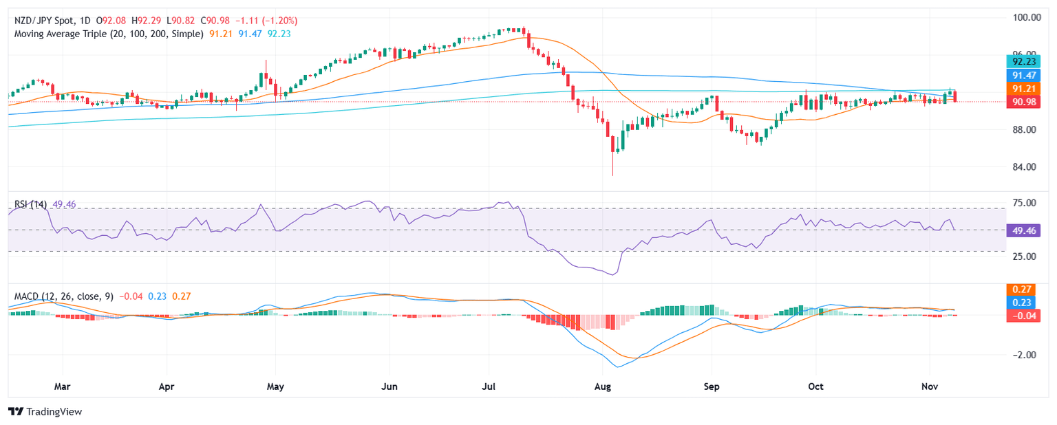 In Friday's session, the NZD/JPY declined by 1.20% to 91.00, continuing its bearish momentum. This break below the crucial 91.00 support level and the convergence of the 20 and 100-day Simple Moving Averages (SMAs) further confirms the strength of the selling pressure.