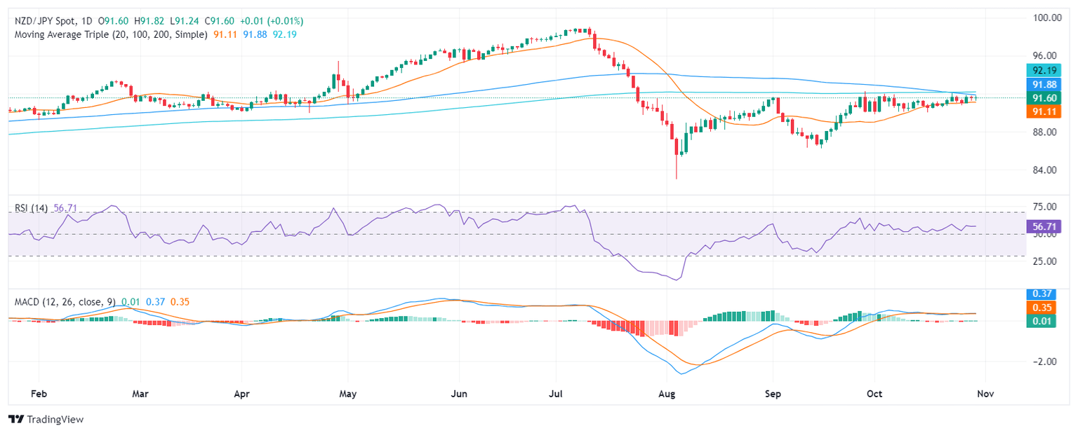 In Wednesday's session, the NZD/JPY pair exhibited a modest upward movement, reaching 91.60. The overall technical picture suggests a prevailing neutral to bullish bias for the short-term, due to mixed signals from technical indicators. In addition a bearish crossover between the 20, 100 and 200-day Simple Moving Averages (SMA) might also change the outlook.
