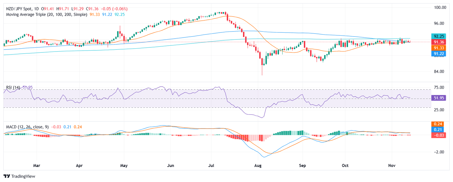 The NZD/JPY pair declined mildly to 91.40 on Thursday's session and continued trading within the range of 92.00-91.00. Indicators are neutral with no clear dominant, but a recently completed bearish crossover between the 20 and 100-day Simple Moving Averages (SMAs) might eventually push the pair lower.