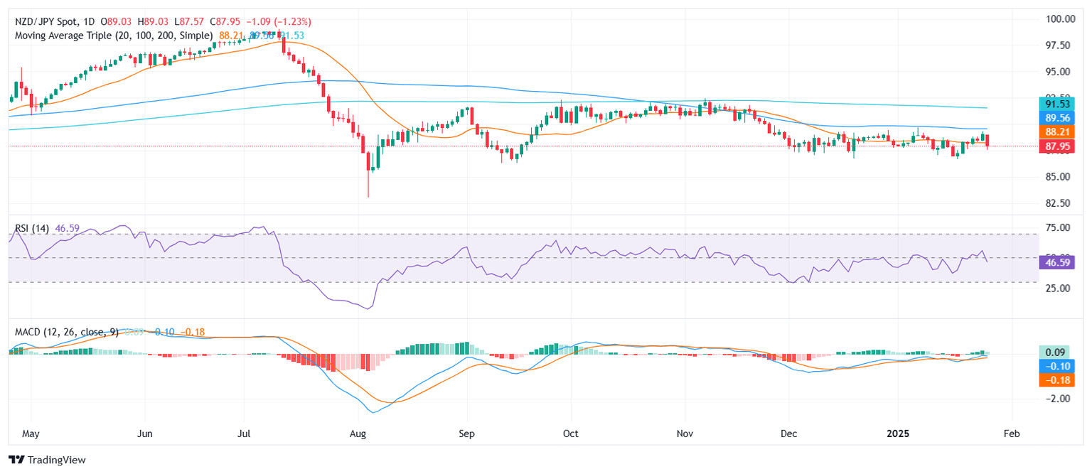The NZD/JPY pair saw a steep decline on Monday, falling 1% to land at 87.95 dropping below its 20-day Simple Moving Average (SMA). This move extends the bearish trajectory observed in recent sessions, with the pair breaking below near-term support levels. The broader sentiment remains negative, as traders grapple with intensified selling pressure and uncertain momentum.