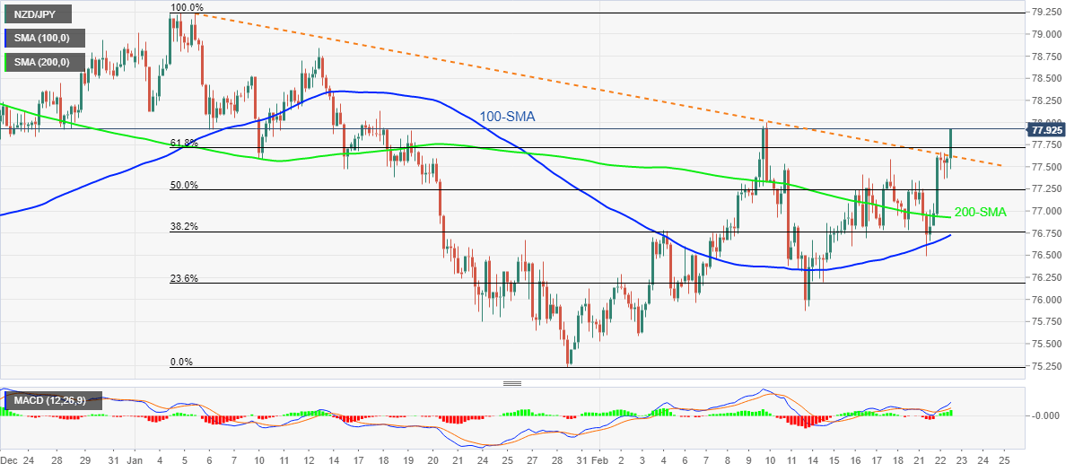 NZD/JPY extends the previous day’s rebound from a one-week low while refreshing a fortnight high around 77.85, up 0.50% intraday during Wednesday’s Asian session.