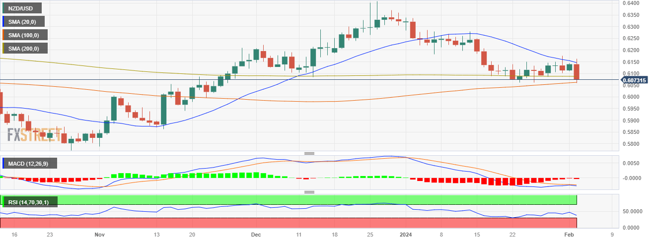 - The NZD/USD showed a strong downward swing, falling near the 0.6060 level.