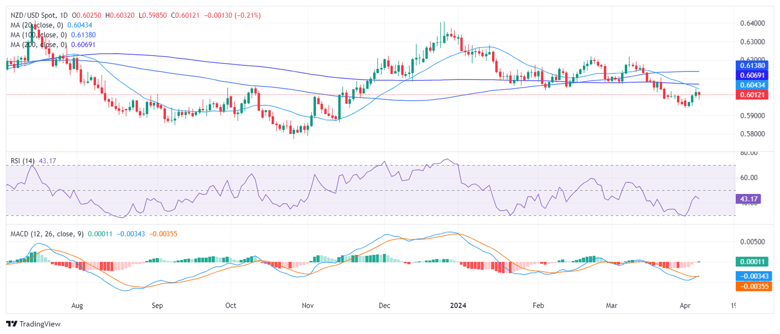 The NZD/USD pair is trading at 0.6013, indicating a drop of 0.26% in Friday's session but will close a winning week. The prolonged downward trend suggests that sellers command the current market. However, the short-term outlook reveals a slight bullish momentum, which could lead to a period of sideways trading in the next sessions.