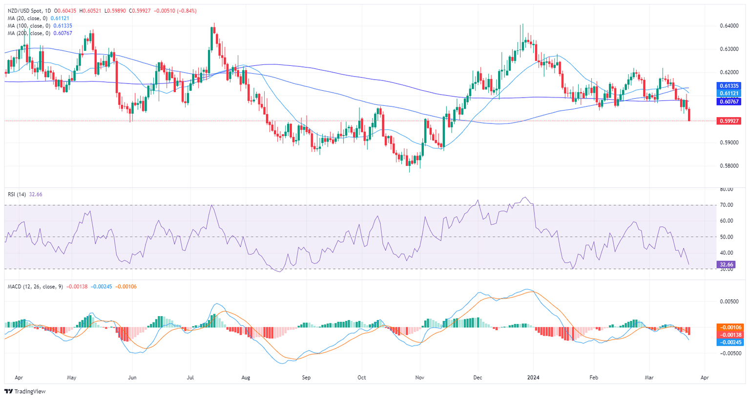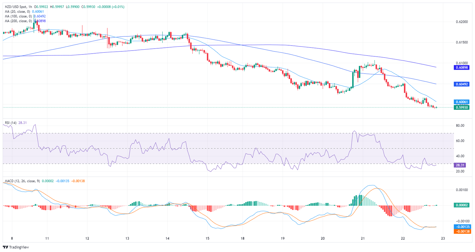 In Friday's session, the NZD/USD declined just below the 0.6000 threshold, illustrating a bearish outlook as sellers continue to dominate the market. The pair is positioned below its primary Simple Moving Averages (SMAs), further backing the bearish perspective. Technical indicators hint at a strengthening sellers' command but indicators lay in oversold terrain, a typical signal, and the buying momentum might recover.