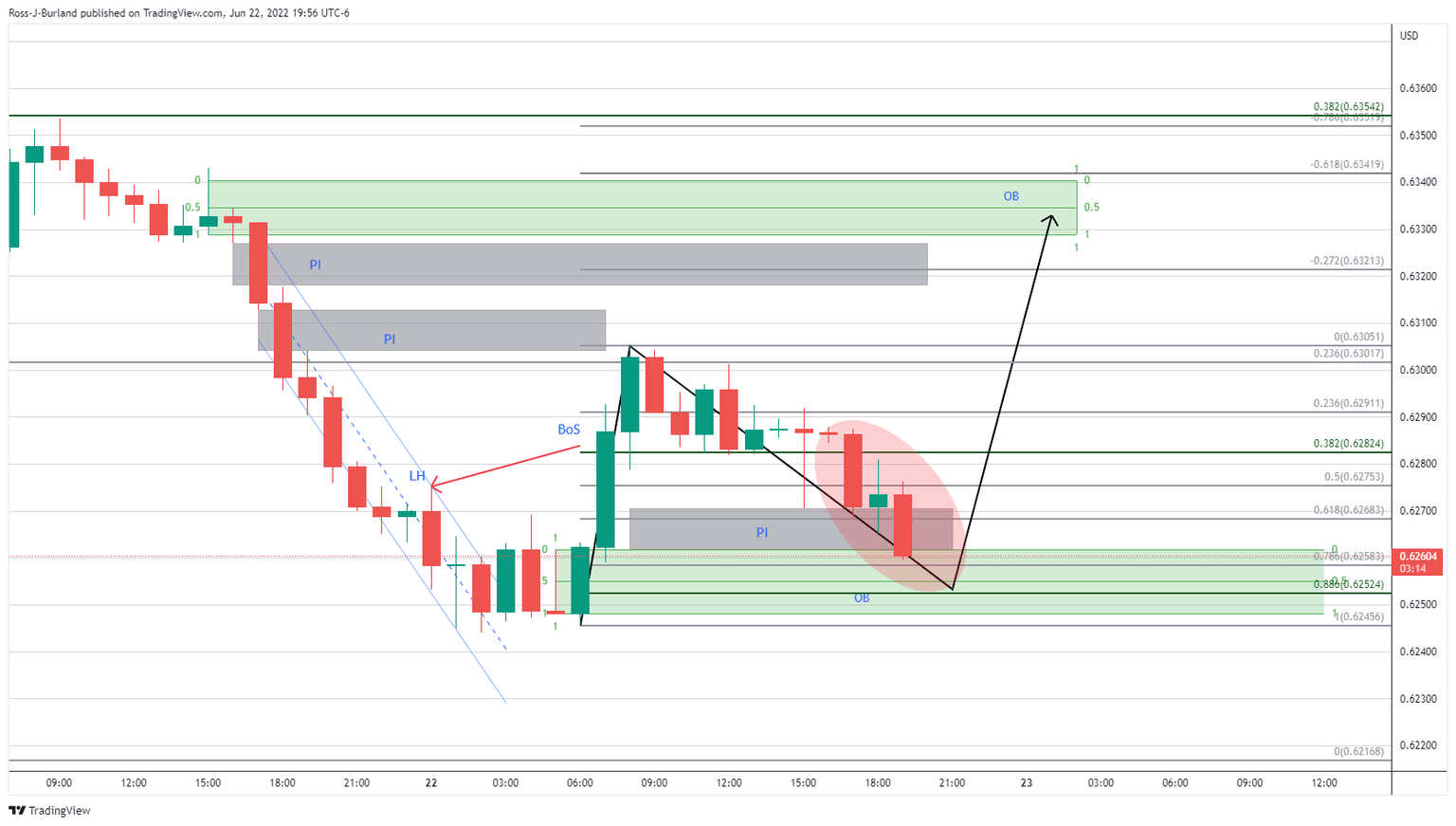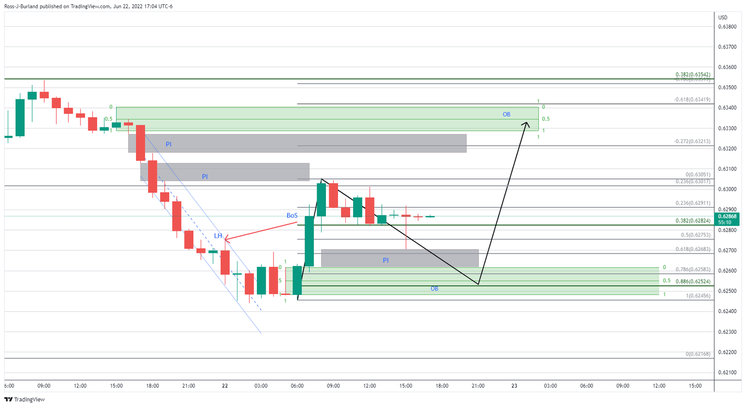 In the 1-hour chart above, it was explained that there was ''a recent break of structure to the upside.'' It stated that ''should the price fail to move higher from the 38.2% Fibo area near 0.6280, then there is a higher probability that the price imbalance between 0.6270 and 0.6261 will be mitigated which guards the mid point of the demand area, or order block (OB) at 0.6252.''