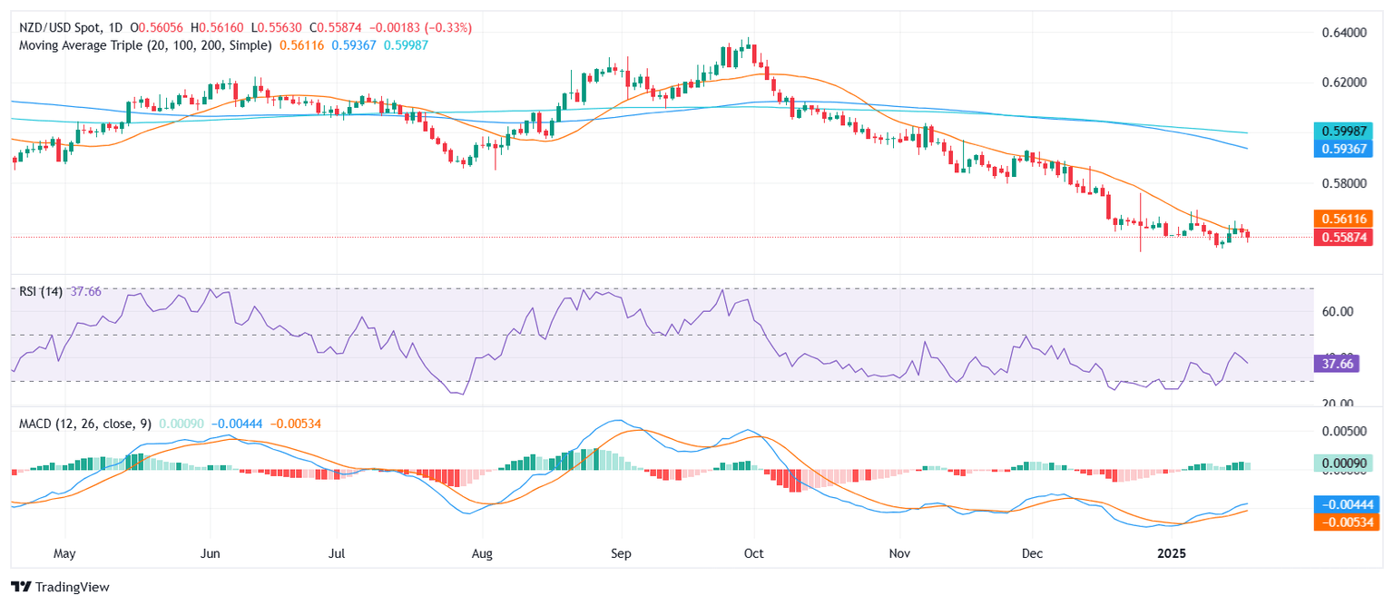 The NZD/USD pair lost ground on Friday, sliding 0.30% to settle near 0.5590. This downturn casts doubt on the sustainability of the pair’s recent consolidation above its 20-day Simple Moving Average (SMA), a region that might still offer a line of defense for buyers hoping to maintain upward traction. With sellers beginning to chip away at gains seen earlier in the week, it remains uncertain whether the pair can cling to its fragile support zone.
