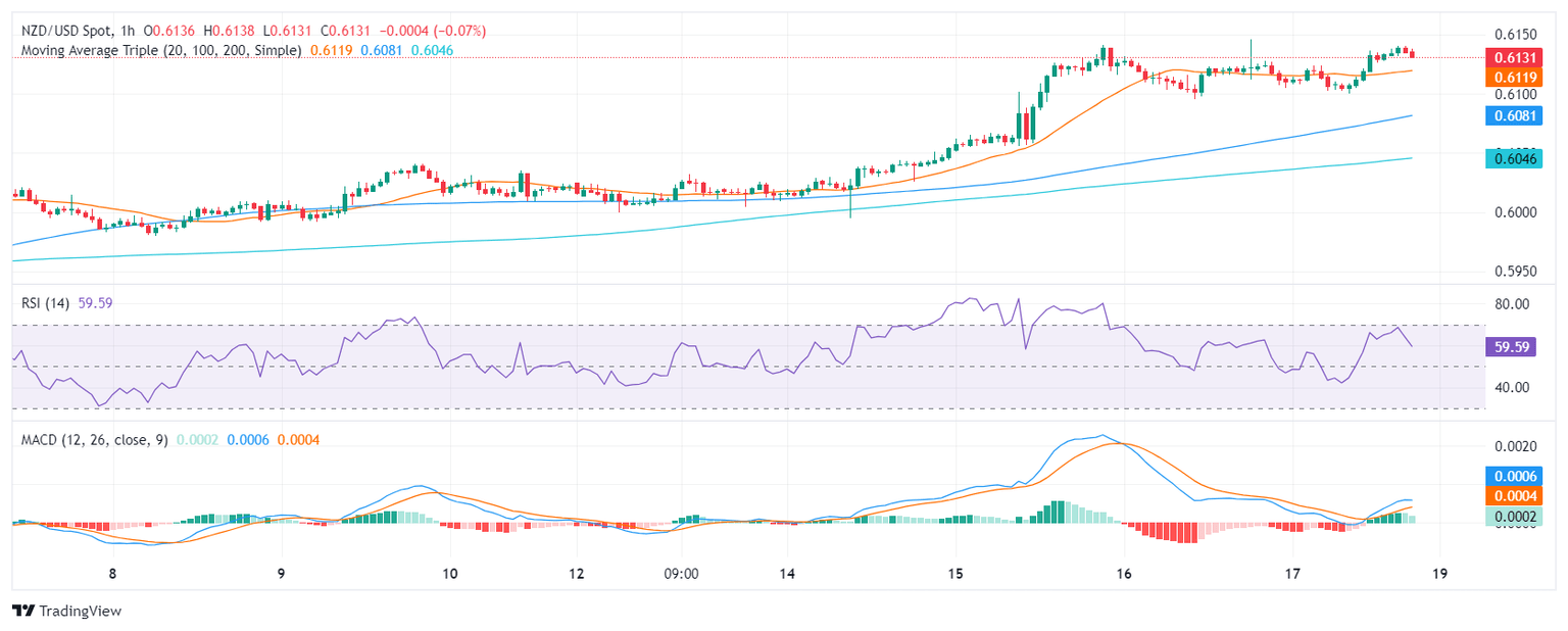 On the daily chart, the Relative Strength Index (RSI) reveals a positive trend, moving from below 60 and nearing the 70 mark. This indicates that the NZD/USD pair is accumulating strength, demonstrating bullish pressure in the recent sessions. Concurrently, the Moving Average Convergence Divergence (MACD) prints green bars, showing steady buying traction.