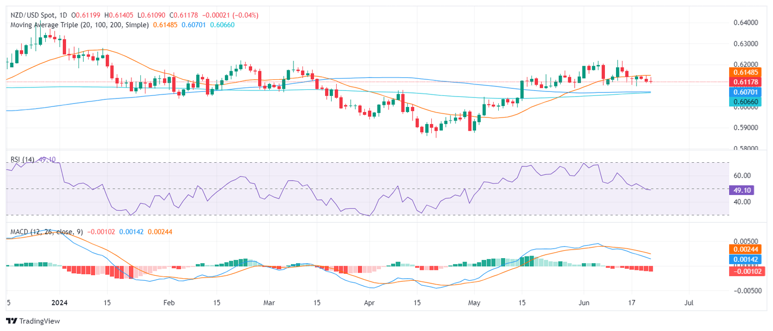 On Friday, the NZD/USD extended its losing streak to three days. Despite an attempt to rally which took the pair to a high of 0.6140, the bulls were unable to return to the positive side and the pair stabilized at 0.6115 The unsuccessful attempt to maintain gains solidifies the increasing bearish sentiment for the Kiwi. The currency pair must climb past the 20-day Simple Moving Average (SMA) situated at 0.6150 to brighten the otherwise negative outlook.