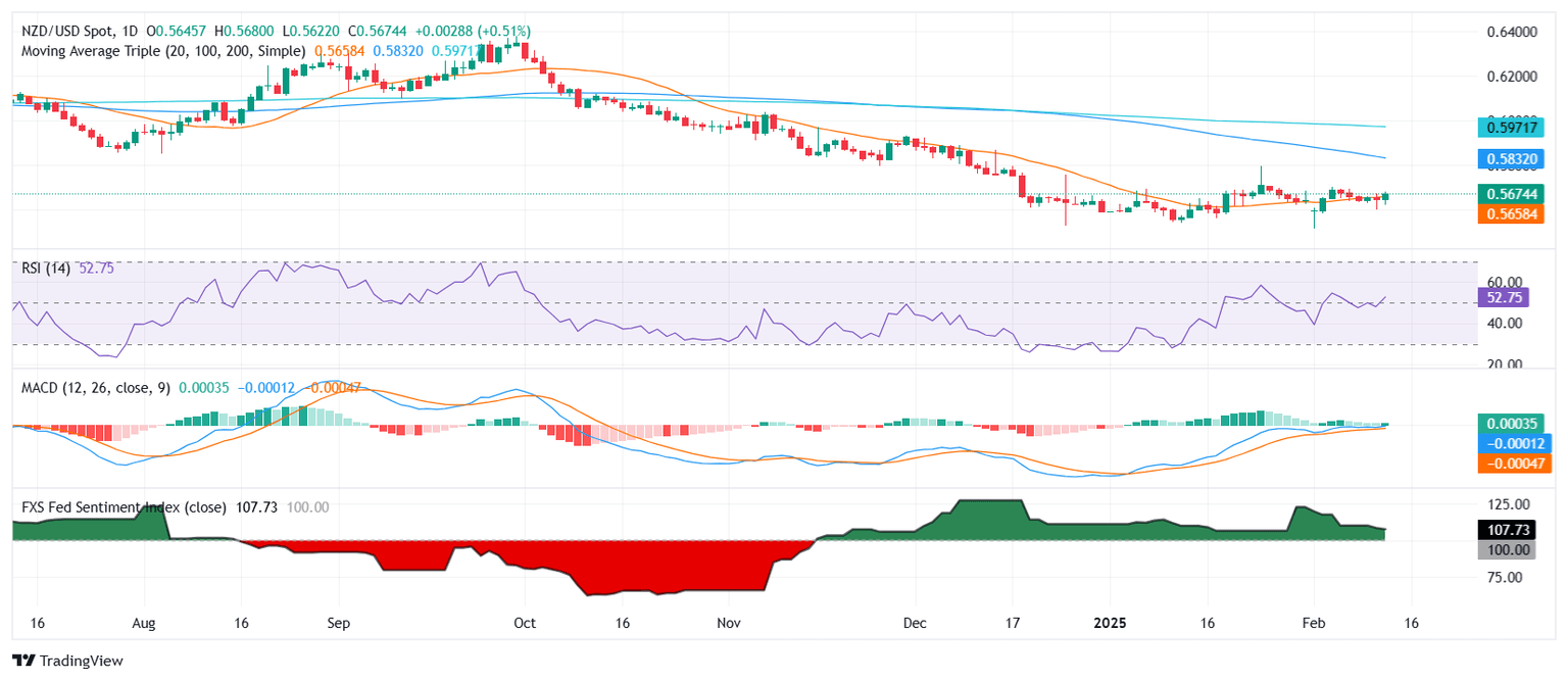 The NZD/USD pair saw a mild increase on Thursday, rising to 0.5650 as buyers attempted to push the price higher. However, the move lacked conviction, with the pair struggling to gain traction above its 20-day Simple Moving Average (SMA). This level has acted as a critical pivot point in recent sessions, and a decisive break above it remains elusive.