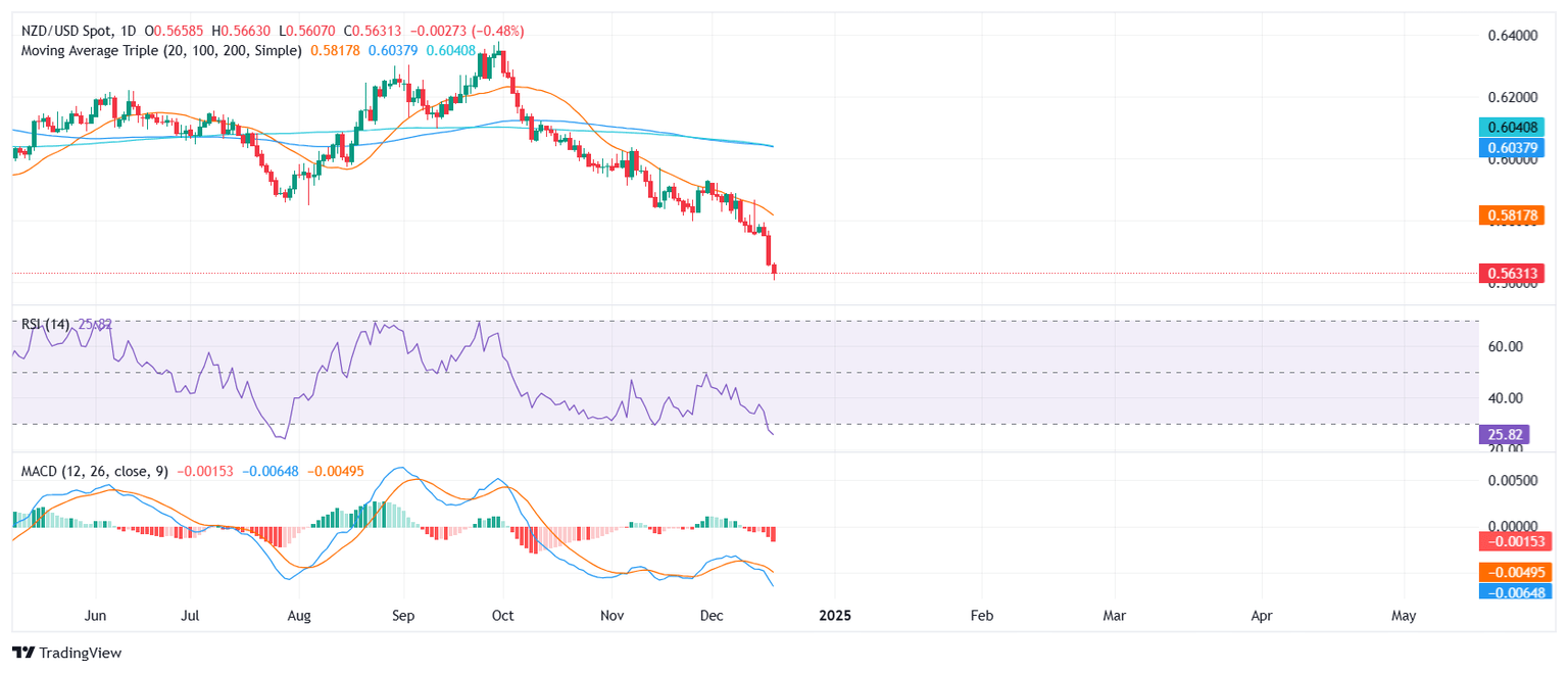 The NZD/USD pair extended its downtrend on Thursday, slipping by 0.36% to approximately 0.5630, a fresh multi-year low. Efforts by the bulls to stage any meaningful recovery continue to falter, as the 20-day Simple Moving Average (SMA), hovering around 0.5890, remains a distant target and a key barrier to halting the decline.