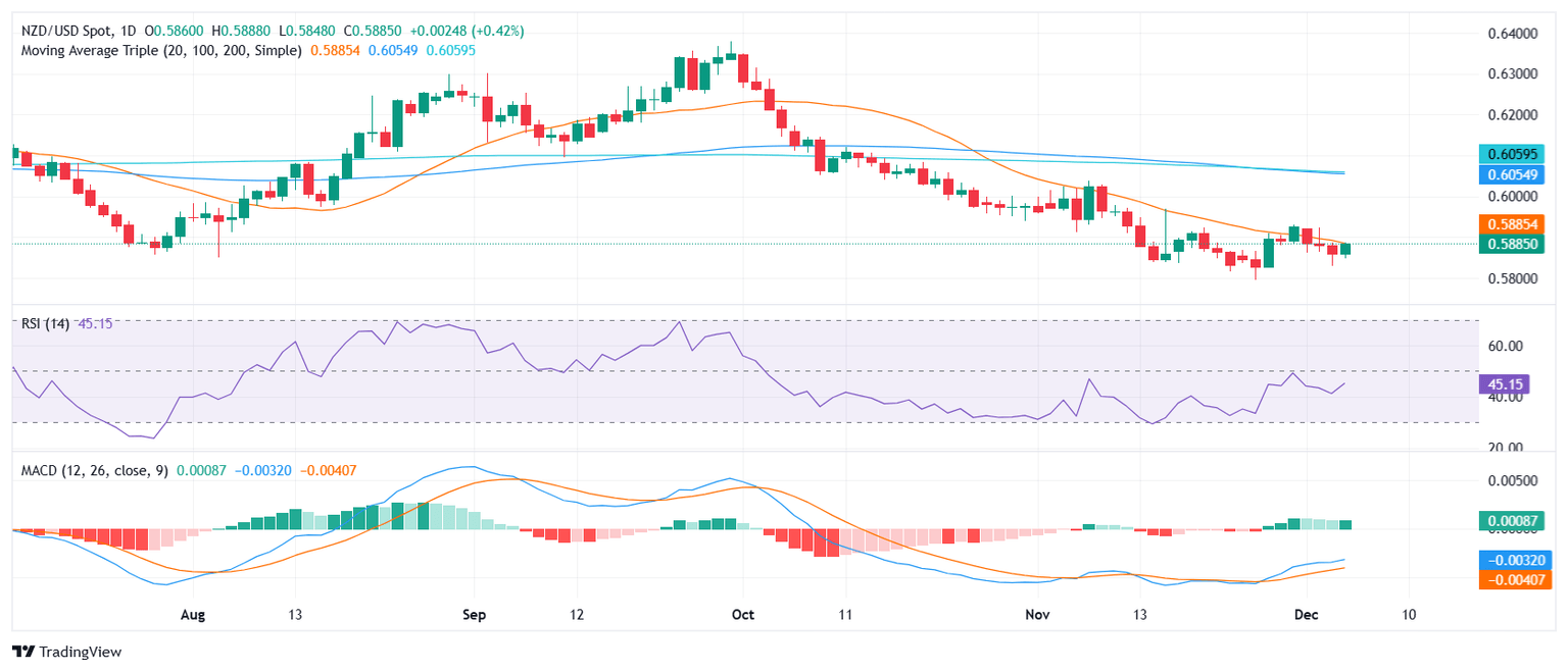 The NZD/USD pair edged higher on Thursday, gaining 0.15% to trade near 0.5890. Despite this upward move, the pair continues to face strong resistance at the 20-day Simple Moving Average (SMA), a level that remains unconquered and keeps the broader outlook tilted to the downside.