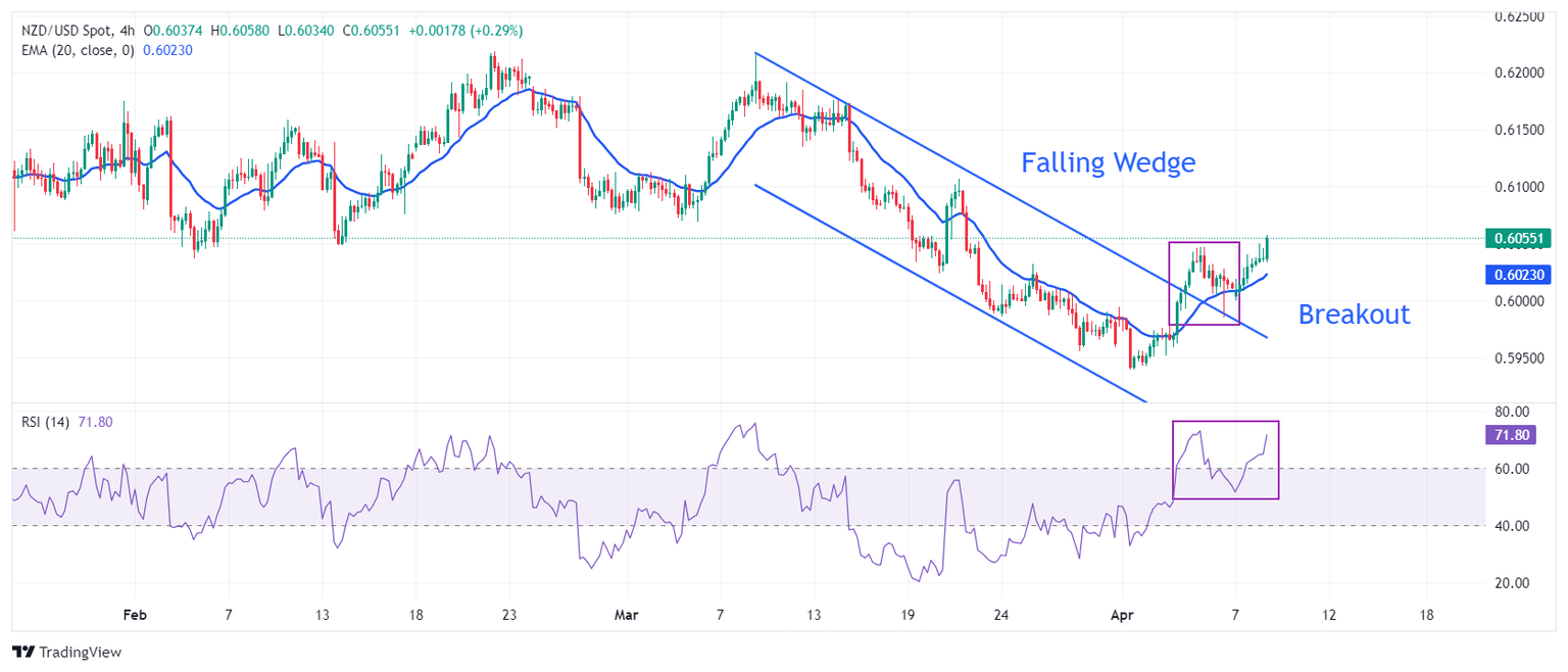 NZD/USD delivers a sharp upside after a breakout of the Falling Wedge pattern formed on a four-hour timeframe. A breakout of the aforementioned pattern suggests a bullish reversal, which exposes the asset to more upside.