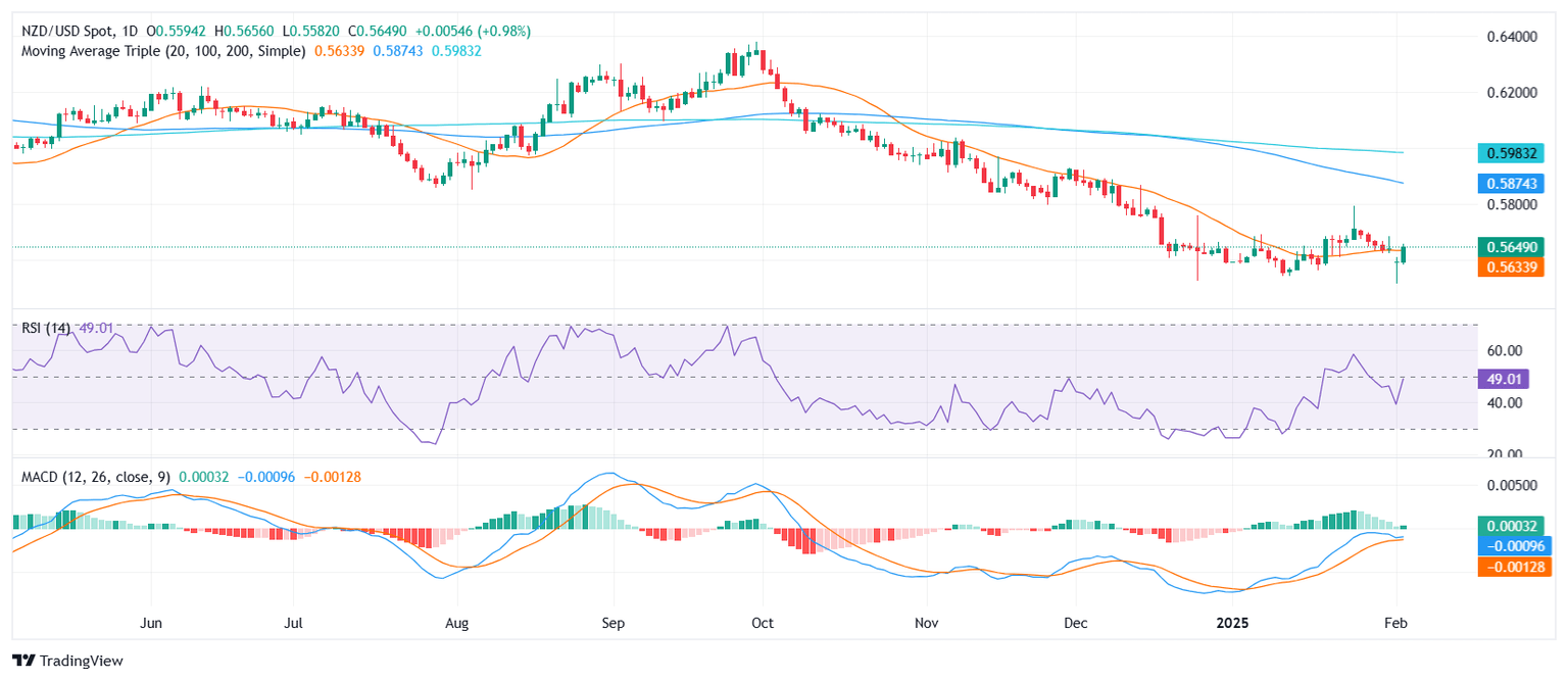 The NZD/USD pair continued its upward trajectory on Tuesday, rising 0.39% to 0.5650 and breaking above its 20-day Simple Moving Average (SMA). This move suggests a potential shift in sentiment, with buyers gaining control after a prolonged period of range-bound movement. The breakout above this technical level could pave the way for further gains in the near term so the pair should focus in building support around this area to secure it.