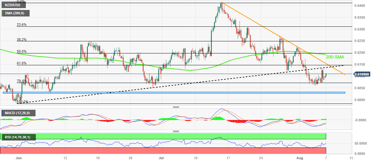 Following that, the 61.8% Fibonacci retracement and a downward-sloping resistance line from July 14, respectively ear 0.6145 and 0.6150, will challenge the Kiwi buyers before giving them control.