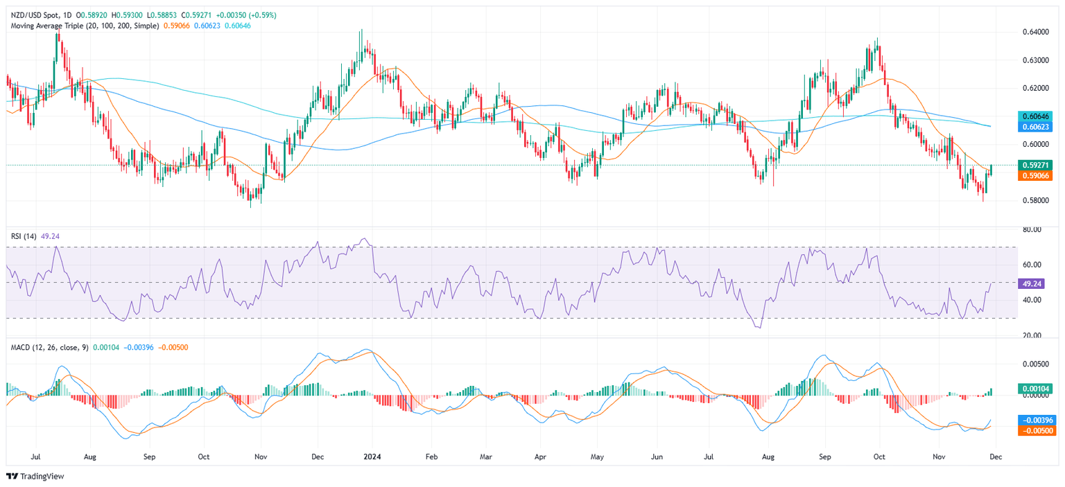 The Kiwi's pair's recent rally has seen it conquer the 20-day Simple Moving Average (SMA) of 0.5905, signaling potential for a bullish reversal. However, the lingering bearish crossover between the 100-day and 200-day SMAs at 0.6060 raises concerns about the sustainability of the gains. Positive technical indicators, including the RSI and MACD, suggest buying pressure is rising and support bullish momentum..