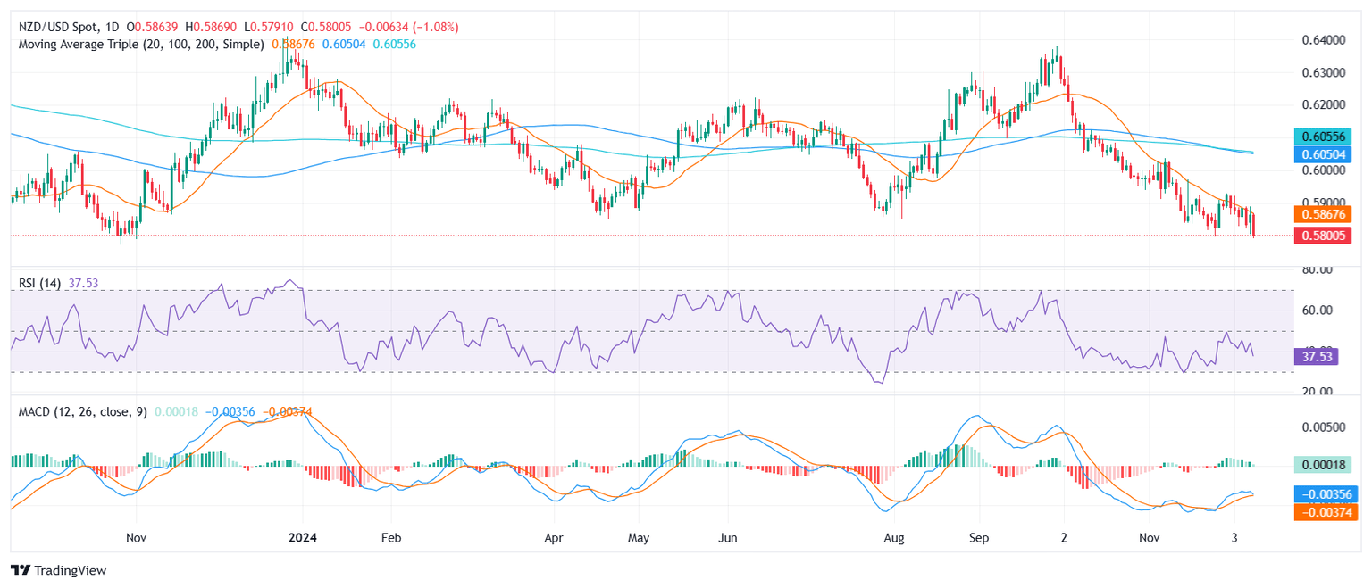 The NZD/USD pair faced renewed selling pressure on Tuesday, dropping by 1.14% to 0.5800 after a failed attempt to reclaim the 20-day Simple Moving Average (SMA). The rejection at this key resistance level highlights the pair's inability to reverse its bearish trend, pushing it to fresh lows not seen since November 2023.