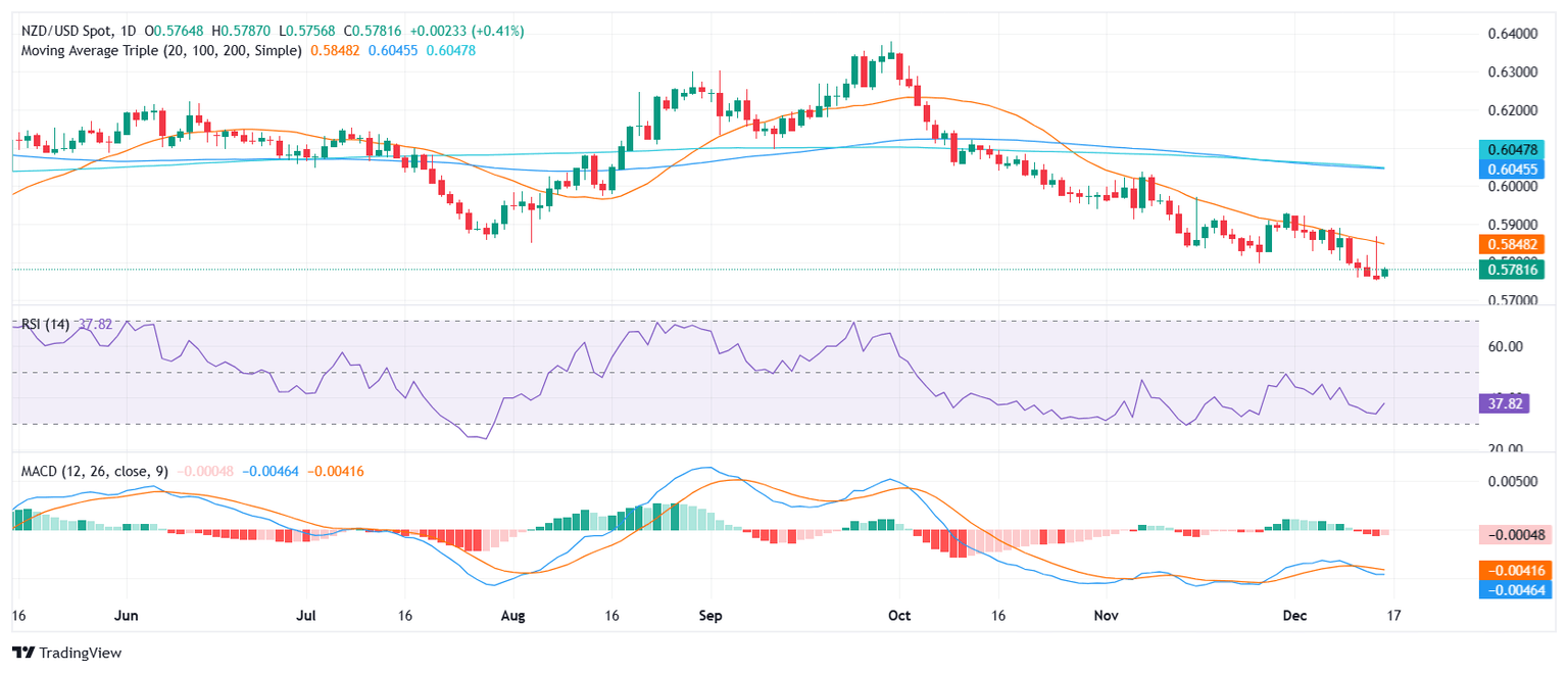 The NZD/USD pair managed a modest recovery on Monday, gaining 0.29% to trade near 0.5780. Although this uptick indicates a slight reduction in selling pressure, the pair continues to trade below the 20-day Simple Moving Average (SMA), currently near 0.5850, which remains a key hurdle to overcome.