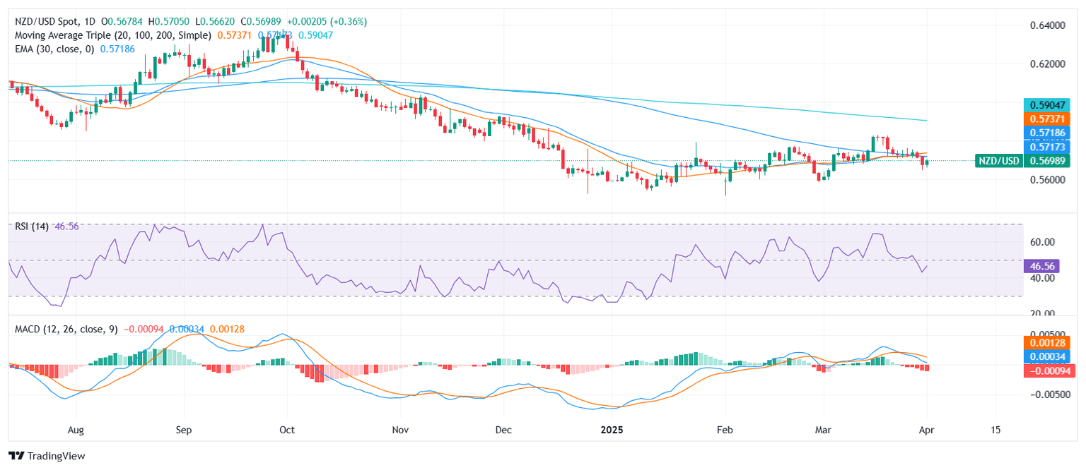 NZD/USD Price Analysis: Pair rises near 0.5700, but bearish pressure still dominates
