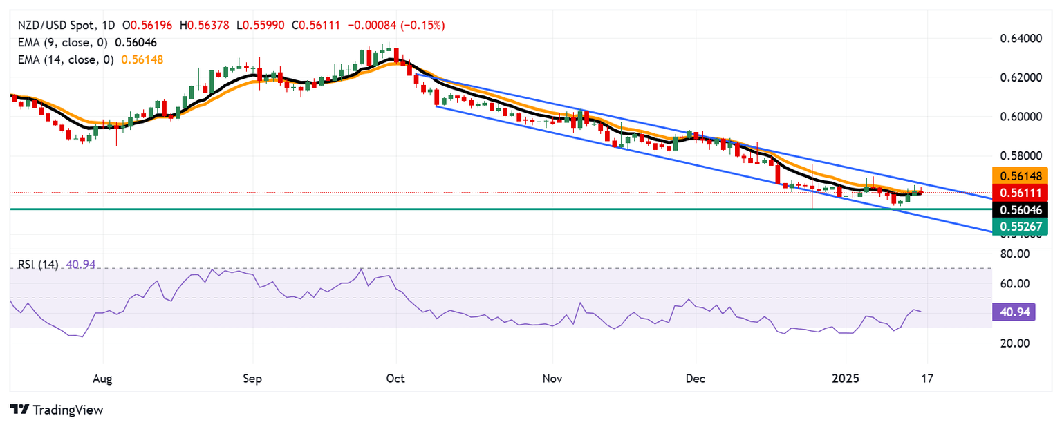 Regarding its support, the NZD/USD pair tests immediate nine-day EMA at 0.5604, aligned with the psychological level of 0.5600. A break below this level could lead the pair to navigate the region around its support area at 0.5526—its lowest point since October 2022, reached on December 25. Further support appears near the lower edge of its descending channel at the 0.5500 level.