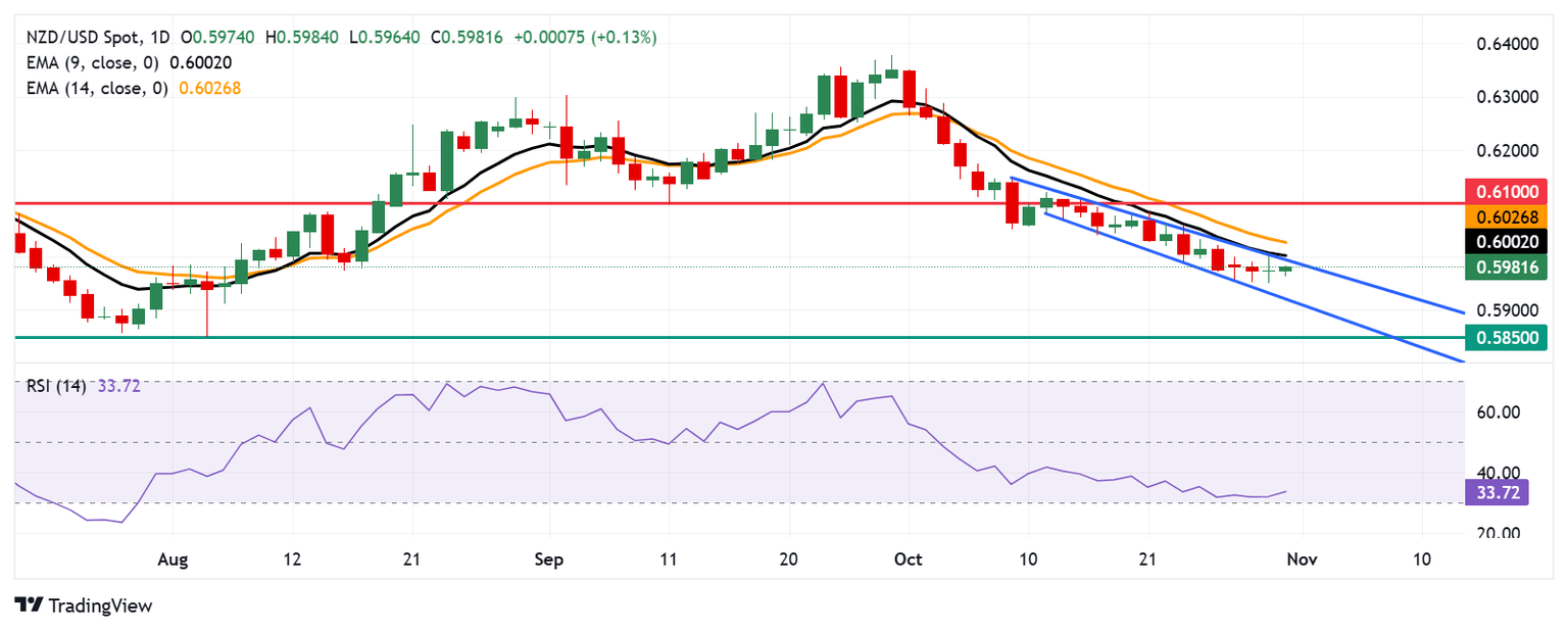 On the resistance side, the initial hurdle for NZD/USD lies at the upper boundary of the descending channel, aligning with the nine-day Exponential Moving Average (EMA) near 0.6001, followed by the 14-day EMA at 0.6026. A sustained move above these EMAs could shift the pair to a short-term bullish stance, potentially targeting the psychological level of 0.6100.