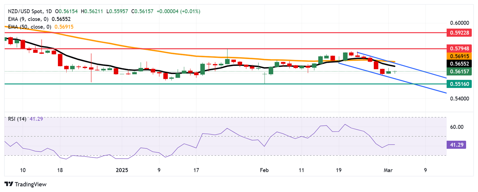 The NZD/USD pair loses ground following the previous session’s gains, trading around 0.5610 during European trading hours on Tuesday. Technical analysis of the daily chart indicates a bearish bias, with the pair trending lower within a descending channel.