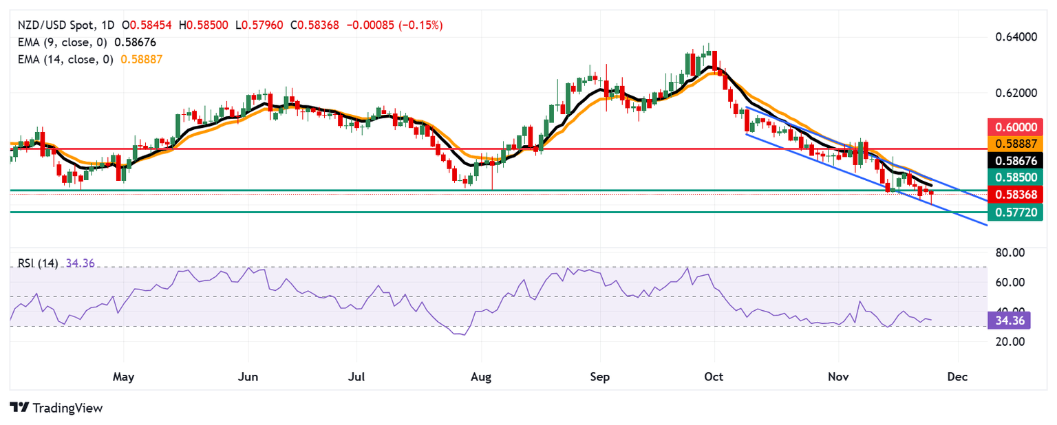 NZD/USD extends its losing streak for the fifth successive day, trading around 0.5840 during European trading hours on Tuesday. A review of the daily chart highlights a deepening bearish trend as the pair moves within a descending channel pattern.