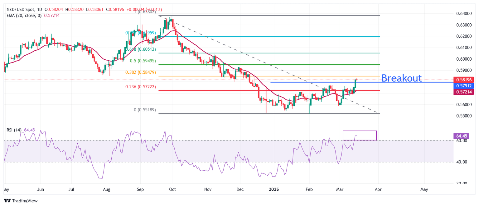 NZD/USD breaks strongly above the key resistance of 0.5800 plotted from the January 24 high. The asset holds above the 20-day Exponential Moving Average (EMA) near 0.5720, suggesting that the near-term trend is bullish.