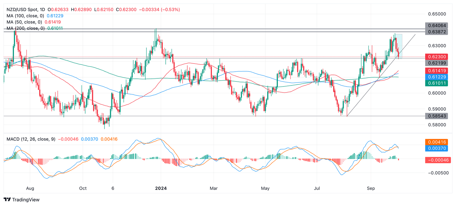 The move down from the September 30 peak has been sharp and accompanied by equally bearish momentum, increasing the chances it could extend further. However, it has just met a formidable support level at around 0.6220 composed of multiple price peaks in the first half of 2024. This is likely to pose an obstacle to bears wishing to push prices lower.
