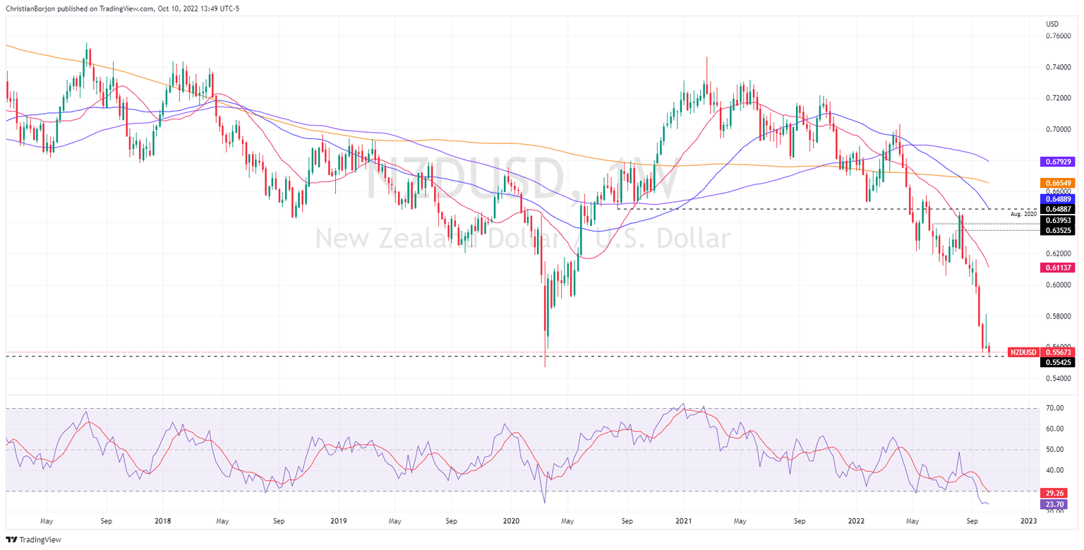 The NZD/USD weekly chart suggests the major could be testing the 2020 yearly low of 0.5469, 100 pips lower than the exchange rate at the time of typing. Nevertheless, RSI’s standing in oversold conditions, alongside price exhaustion, it opens the door for a consolidation. However, traders need to be aware that the release of US inflation figures on Thursday could open the door for further losses beyond 0.5469.