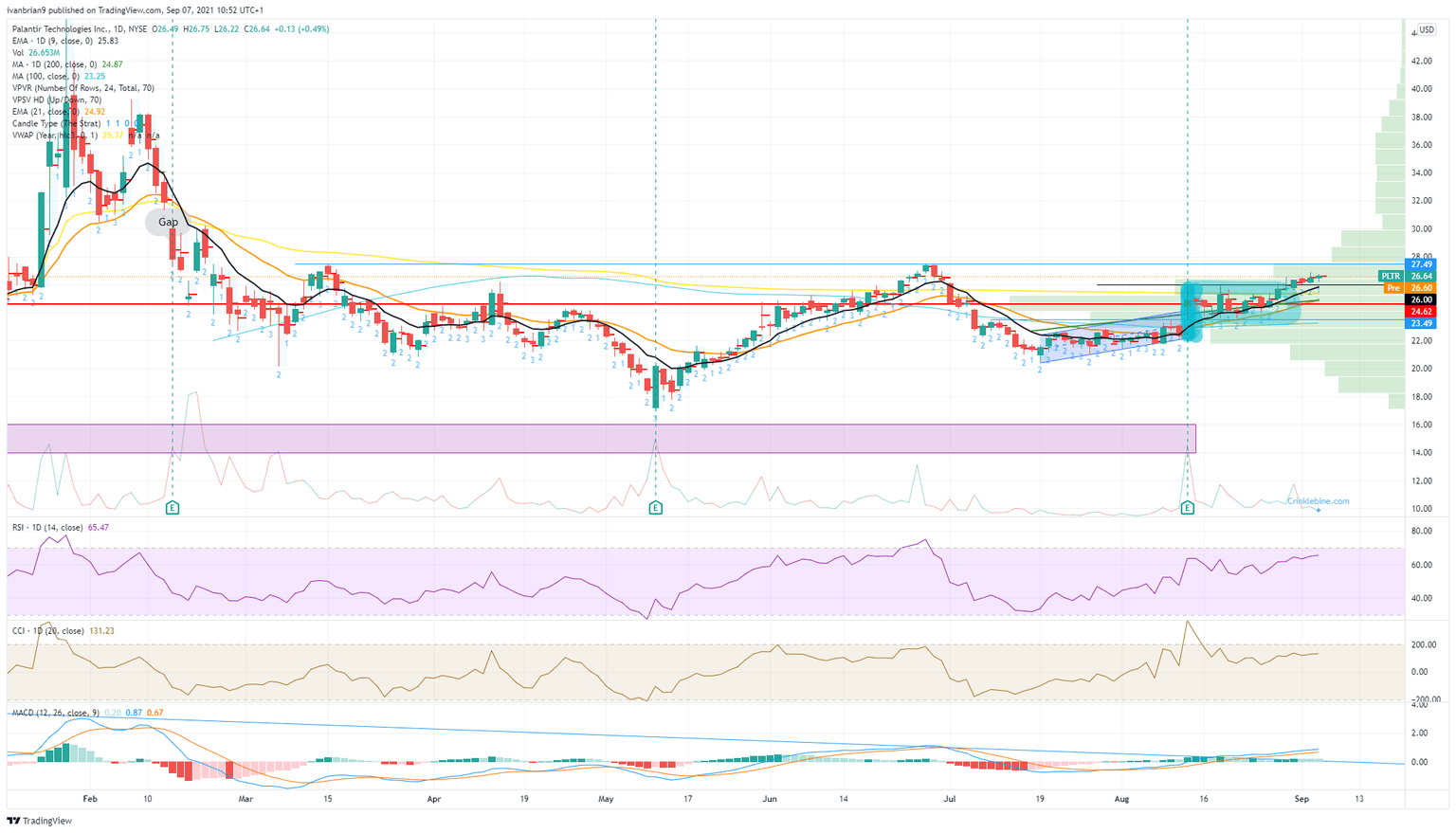 Palantir stock is getting ready to continue the recent bullish gains and push higher. The key resistance to target is the high from June at $27.49. The stock initially broke higher after a set of very strong results on August 12. The earnings per share (EPS) and revenue numbers came in ahead of Wall Street analyst forecasts, but the real showcase was the forward guidance. Palantir doubled its free cash flow guidance from $150 million to $300 million. The company also presented well in the post-earnings conference call, impressing investors with the number of customer wins, large customer revenue and continued progress in winning both public and private sector customers.