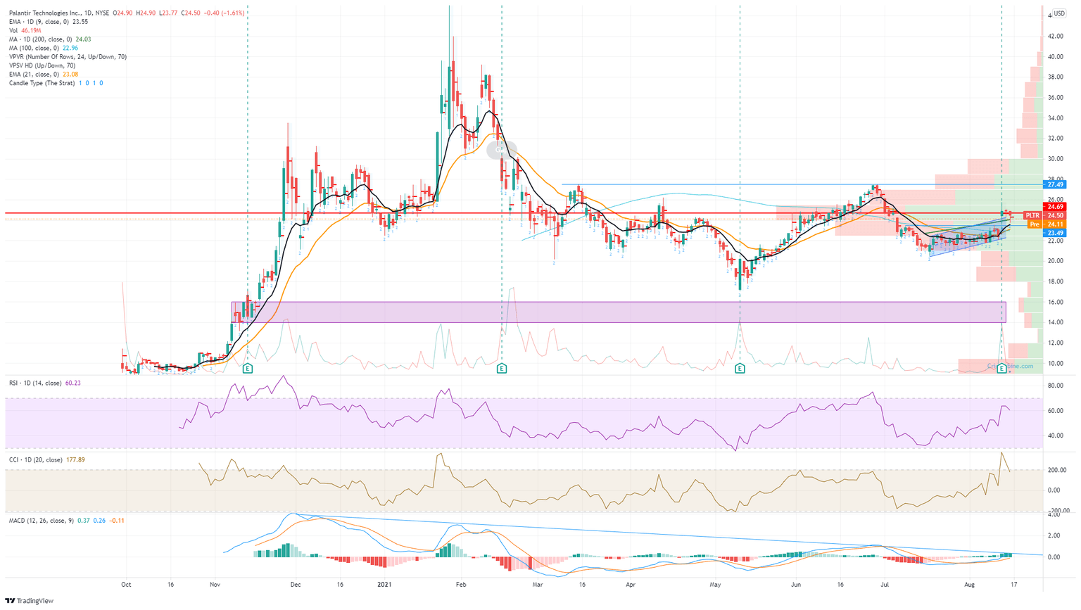 Palantir shares gave up some recent gains on Monday, but the stock still remains strong after last week's very strong earnings numbers. Palantir stock closed lower by 1.6% on Monday to finish at $24.50. We had cautioned on Monday that the explosive move up after results would probably settle down and consolidate as Palantir entered a high volume area. Volume generally means more price acceptance and so more stability in price. This is exactly what happened and no surprise, given the point of control since the company launched on the stock market is at $24.69. The point of control is the price at which there has been the highest amount of volume. Palantir has had some pretty wild swings after having caught the attention of WallStreetBets in the past, but it is a fully-fledged Wall Street favourite now after a series of solid results and a management team full of well-known names..