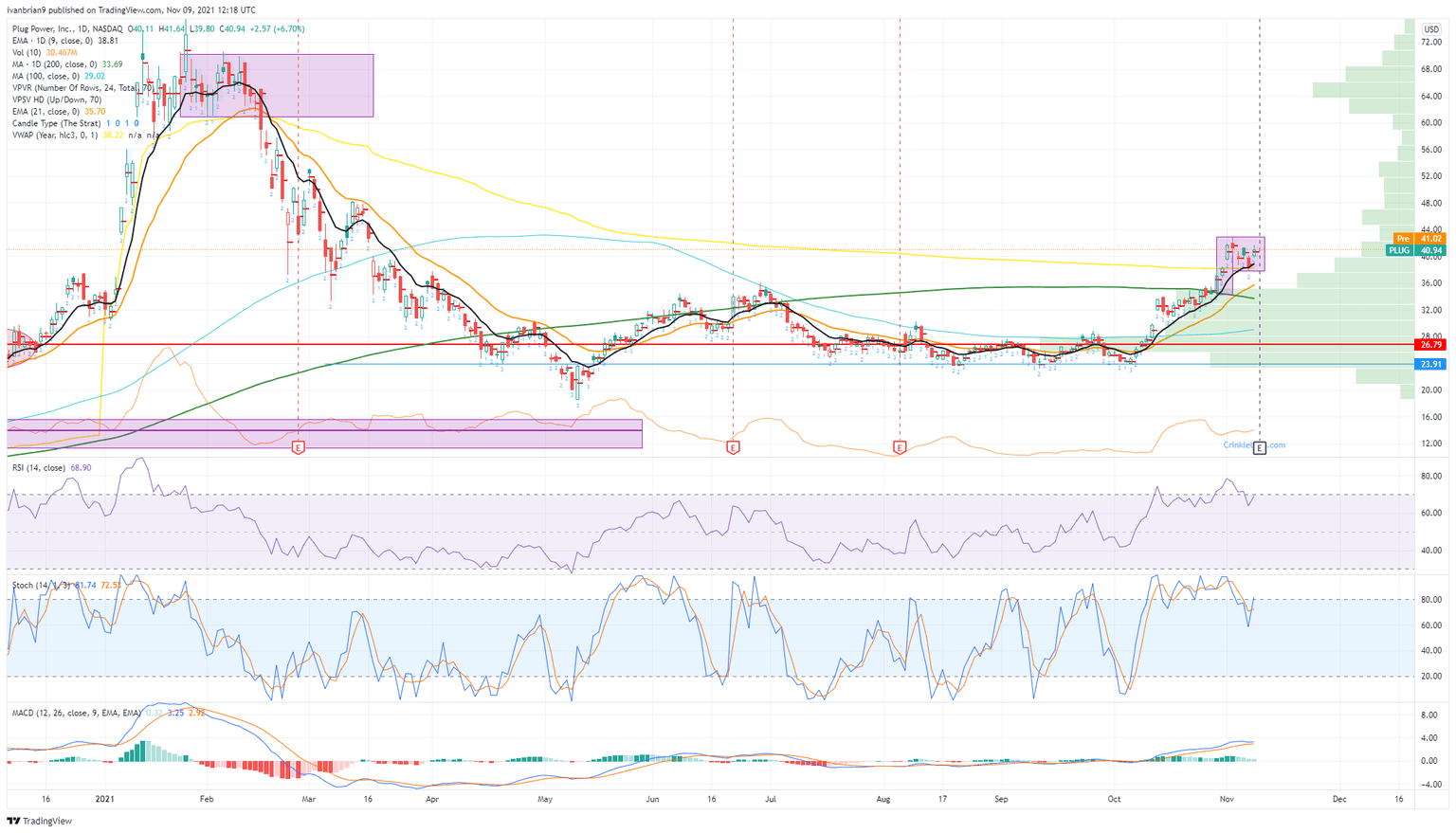 PLUG shares have been trending nicely and have taken out some key levels. The 200-day at $33.69 and the yearly VWAP at $38.22 are now behind us, and PLUG is being guided higher by the 9-day moving average. The extended target is a move back to the consolidation zone from early January and February of this year at $61 to $68, which we have highlighted in the PLUG chart below. Strong support zones are at $33.69 and $28 with some very high volume.