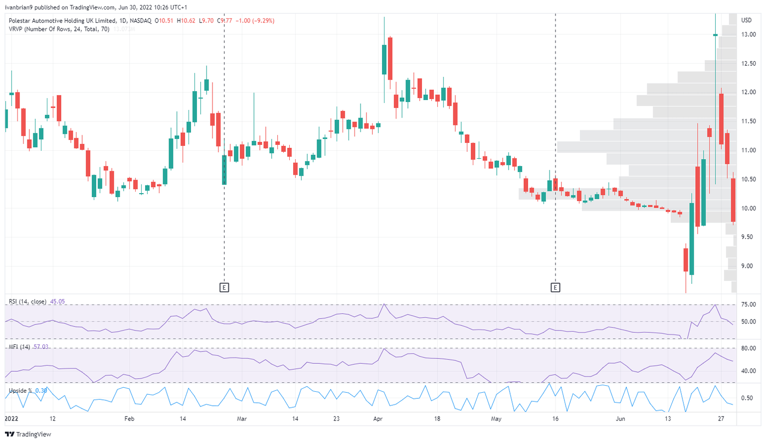 Since the listing, PSNY stock has struggled to hold on to early enthusiasm. Initially, the legacy GGPI stock soared once the vote was carried to list Polestar. That saw the stock rally from below $9 to nearly $13. Polestar (PSNY) stock opened for trading last Friday at $12.98 and pushed up to $13.36 before closing nearly unchanged at $13. That was a worrying sign in itself, and we wrote last week that we expected the stock to suffer from a lack of news flow. However, we did not expect things to turn lower quite so quickly or dramatically. Indeed, Friday's candle has a huge wick, and this is often a turnaround signal as it shows indecision in the market. Since Friday, Polestar (PSNY) has been down every day this week, moving from $13 to back under $10 now.